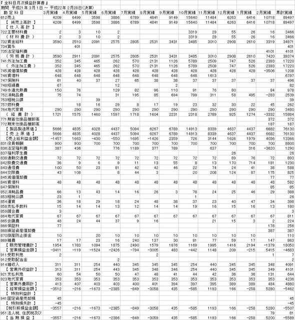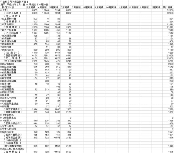 会計ソフトからアウトプットされた、CSVファイルの当期進行期途中の月次損益推移表です。